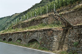 After seeing the photographs in the small exibition, I came to realise that the strange arched wall alongside the road Leiwen – Neumagen (picture at right, near Trittenheim) was in fact the remaining understructure of the former railroad.